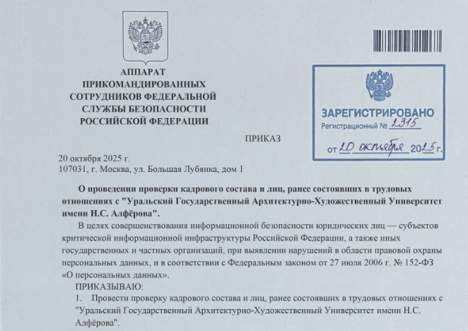 В Уральском государственном архитектурно-художественном университете зафиксирована попытка мошенничества. Как сообщают в вузе, злоумышленники распространили ложный приказ о проведении внеплановой проверки кадрового состава учебного заведения.