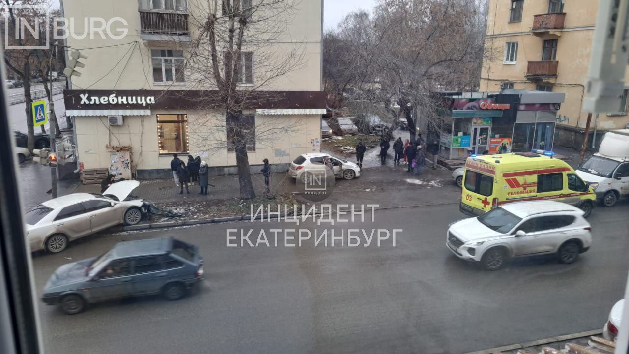 На место происшествия приехала реанимация. По данным издания «Инцидент Екатеринбург», в ДТП пострадала девушка, стоявшая у светофора на углу дома по улице Машиностроителей, 20. Предположительно, после столкновения один из автомобилей выехал на тротуар и сбил её.