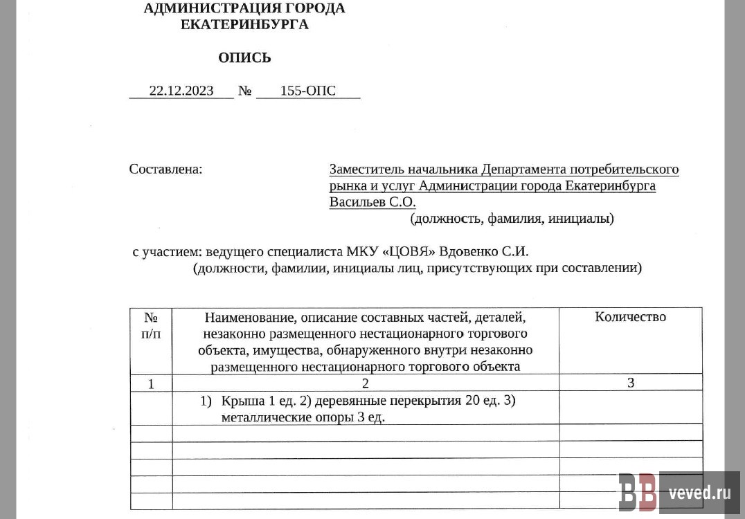 Фрагмент описи от 22 декабря 2023 года о вывозе НТО, составленной администрацией Екатеринбурга