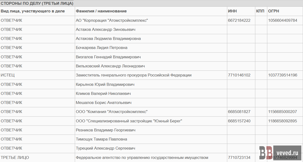Ответчиками значатся АО «Корпорация "Атомстройкомплекс"», ООО «Компания "Атомстройкомплекс"», ООО «Специализированный застройщик "Южный берег"» и 11 физических лиц. Бенефициары компании (главным считается Валерий Ананьев) среди ответчиков не значатся.